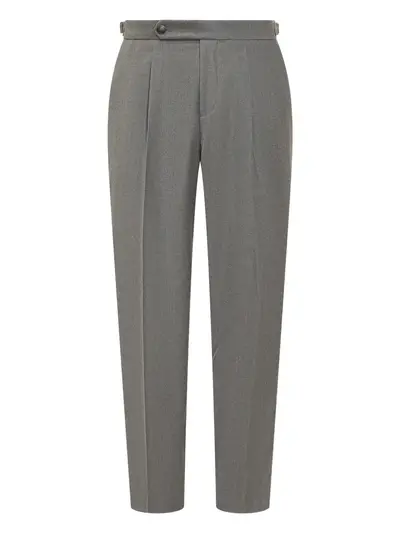 grey pleat detail belt loops button fastening back welt pockets adjustable waist tabs