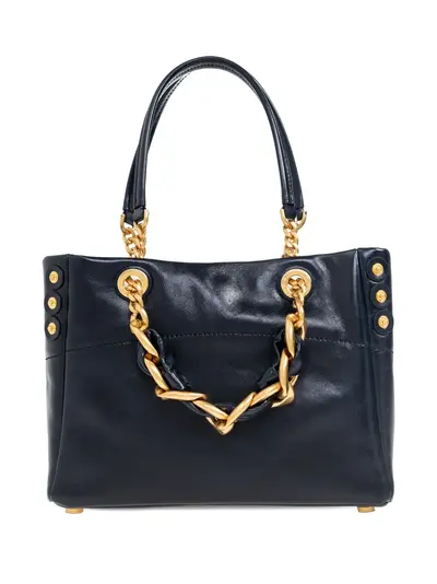dark blue chain embellishment studded detail top handle gold-tone hardware feet at base