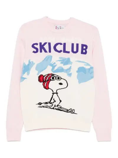 pink intarsia knit Snoopy motif round neck long sleeves ribbed trim