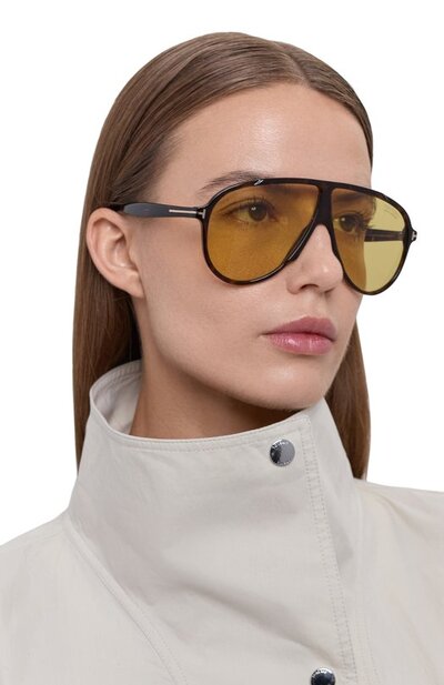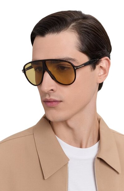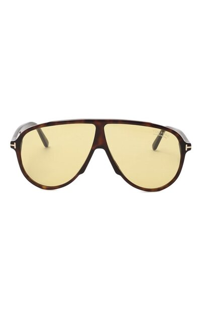 Солнцезащитные очки Vladimir выполнены из ацетата с черепаховым узором. Модель с золотистыми Т-образными вставками на дужках дополнена желтыми линзами, на 100% блокирующими ультрафиолетовые лучи.