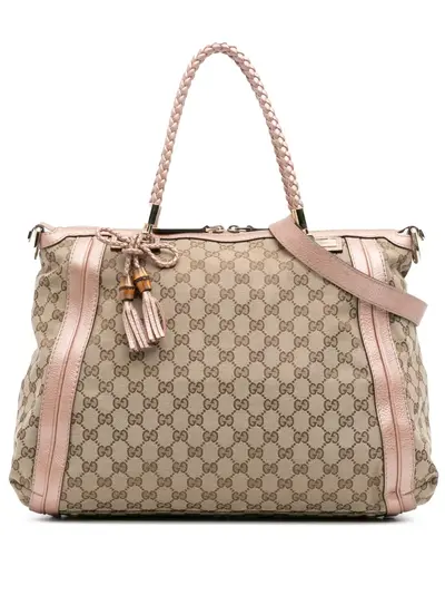 The Bella satchel features a canvas body with leather trim, a leather braided handle, a detachable strap, a top zip closure, and an exterior zip pocket. Brown. Serial Number: 269946 213317. Inclusions: shoulder strap, dust bag. Condition: EXCELLENT. This previously owned item is in near-perfect condition with no signs of damage or use. Please refer to the photos on this product page for a detailed view of the item, including any damages declared.