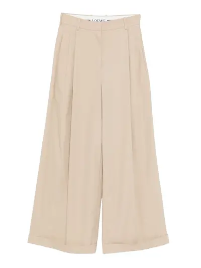 taupe front button and zip fastening two side inset pockets rear jetted pocket turn-up hem