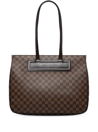The Parioli GM features a damier ebene canvas body with leather trim, flat leather straps, an open top, an exterior slip pocket, and interior slip pockets. Brown. Serial Number: AR0969. This item has no inclusions. Condition: GOOD. This previously owned and used item is in good condition with minimal signs of use. This may include fading of material or plating and scratches. Due to the exclusivity of this item and its limited availability, processing and delivery might take longer than usual. Declared Damages: Exterior Side Feature(s) Moderate Cracks. Please refer to the photos on this product page for a detailed view of the item, including any damages declared.