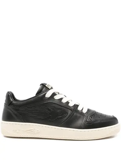black logo detailing front lace-up fastening round toe flat rubber sole