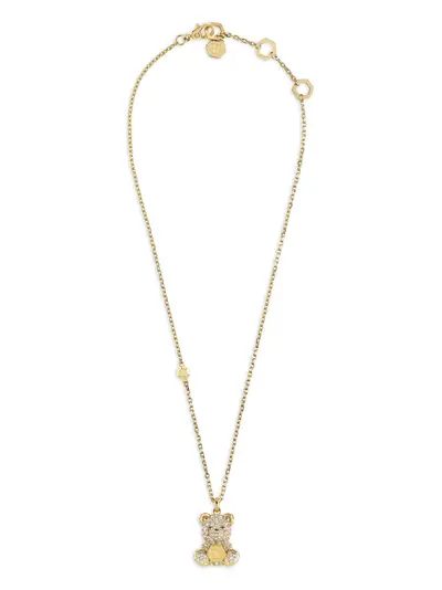 gold-tone crystals teddy pendant lobster clasp closure Normal everyday use and external agents may reduce the lustre of gemstones and gold surfaces. To maintain, use specific, non-abrasive products specially meant for cleaning jewellery.