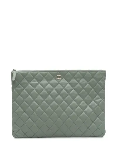 This clutch features a quilted lambskin leather body, a top zip closure, an exterior back slip pocket, and an interior zip pocket. Green. Serial Number: 25297869. This item has no inclusions. Condition: EXCELLENT. This previously owned item is in near-perfect condition with no signs of damage or use. Please refer to the photos on this product page for a detailed view of the item, including any damages declared.