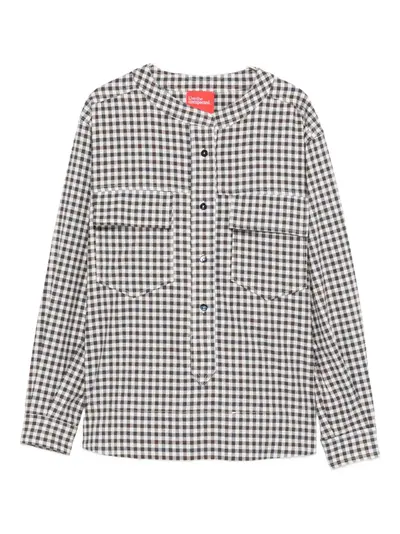 brown gingham pattern front button fastening chest flap pockets long sleeves round neck
