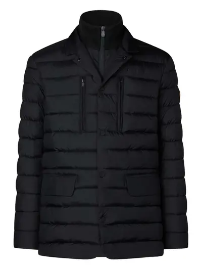 black button fastening chest pockets side pockets high neck horizontal quilting
