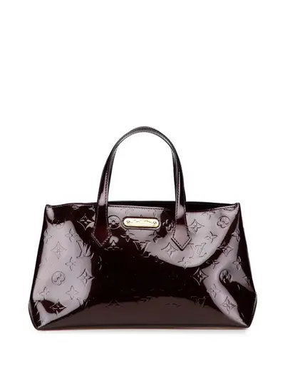monogram vernis leather body flat leather handles open top with a lobster clasp closure interior zip pocket purple This item has no inclusions. Condition: GOOD. This previously owned and used item is in good condition with minimal signs of use. This may include fading of material or plating and scratches. Please refer to the photos on this product page for a detailed view of the item, including any damages declared.