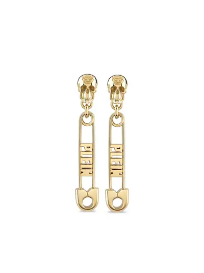 gold-tone skull detail safety pin design Normal everyday use and external agents may reduce the lustre of gemstones and gold surfaces. To maintain, use specific, non-abrasive products specially meant for cleaning jewellery. These earrings come as a pair.