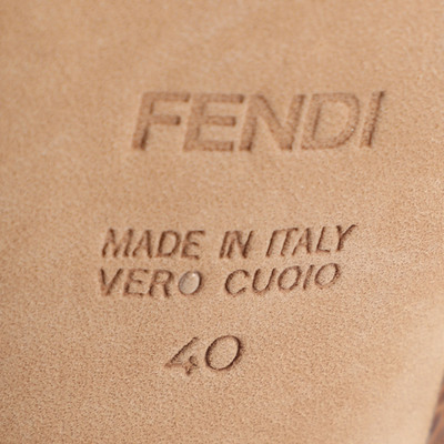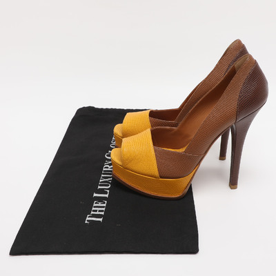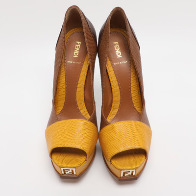 Fendi merges brown and yellow lizard embossed leather into a peep toe Fendista pump. The sharp cut topline and 14 cm heels enhance the shape visually, while tactile texture gives the silhouette depth.