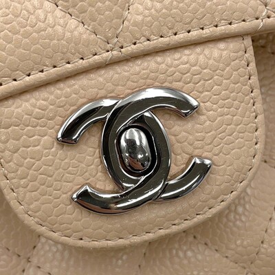 Chanel’s classic double flap bag in beige caviar leather features the iconic quilted finish and interlocking CC clasp. Silver hardware and a 25cm size complete the look.