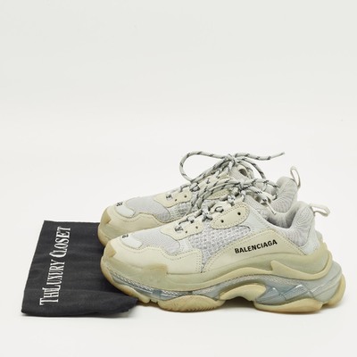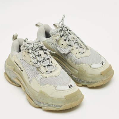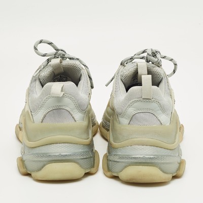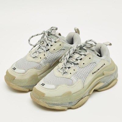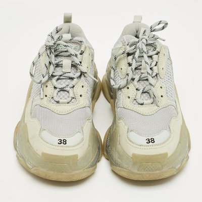 Statement making and chunky, these Balenciaga Triple S sneakers feature pastel blue faux leather and mesh with a transparent sole. Designed for bold streetwear aesthetics, they add height and impact. A contemporary icon for fashion forward wardrobes.