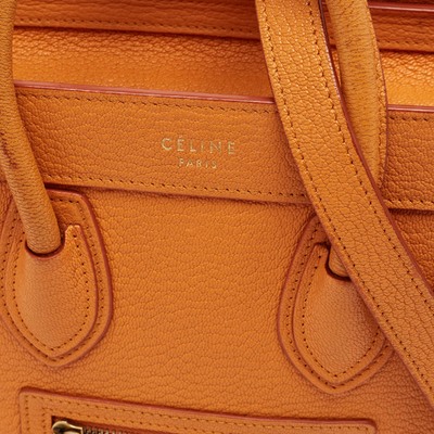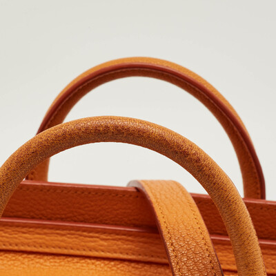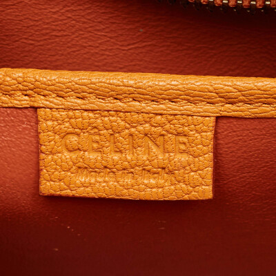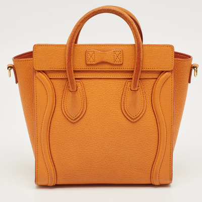 The usage of orange leather on the exterior gives this Celine Luggage tote a high appeal. An eye catching accessory, the bag features a front zipper pocket, dual handles at the top, and gold tone hardware. The leather lined interior is equipped with enough room to accommodate more than just your phone and tiny essentials. The flappy wings at the sides and the brand signature on the front complete the design.