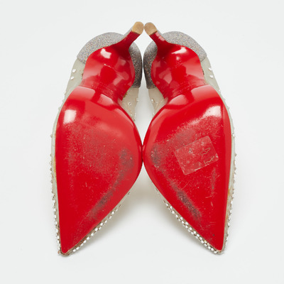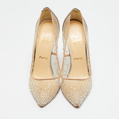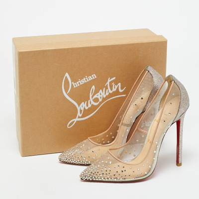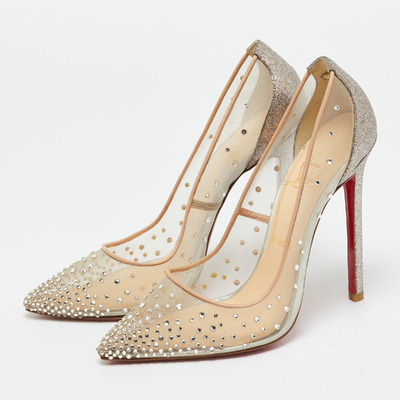 These stunning Louboutin Follies Strass pumps feature a unique blend of metallic mesh, beige velvet, and crystal embellishments. The transparent design creates an illusion effect with sparkling accents throughout. Ideal for evening events or red carpet worthy looks.
