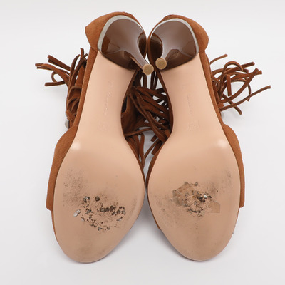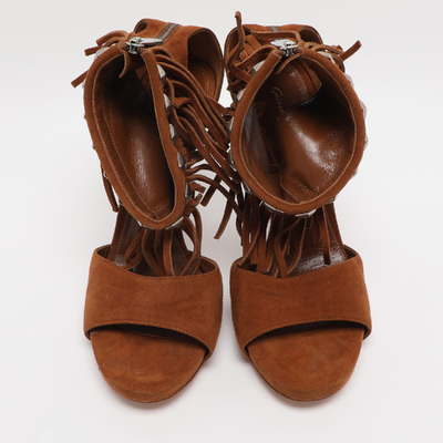 These Gianvito Rossi sandals stand out with layered brown suede fringe and wrap around ankle ties. Bohemian yet luxurious, they add movement and texture to any ensemble. Ideal for festival looks or chic summer outfits.