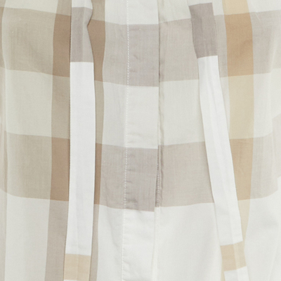 This Burberry Brit shirt is crafted in crisp white cotton with subtle checked detailing for a touch of signature charm. The tie neck design adds a refined, feminine twist to the sleeveless silhouette. Perfect for layering under blazers or styling solo on warm days.