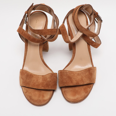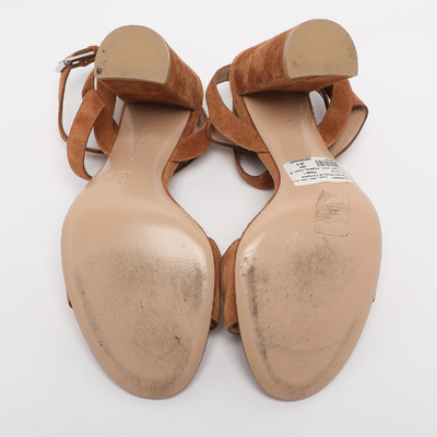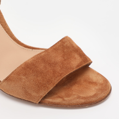 These Gianvito Rossi sandals feature luxurious brown suede with a classic ankle strap for secure and flattering support. Elegant and versatile, they transition seamlessly from day to night. A timeless staple for refined warm weather styling.