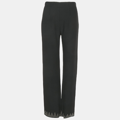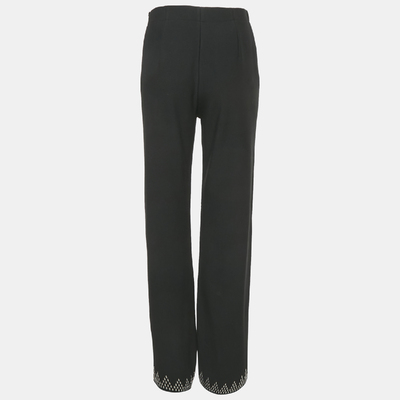 Alaïa’s black crepe trousers elevate classic tailoring with intricate embellishments that glimmer subtly along the seams. Sculpted to perfection, the structured fit mirrors the designer’s architectural precision. Elegant yet bold, they redefine modern eveningwear with a distinctive Parisian allure.