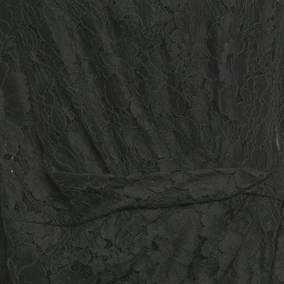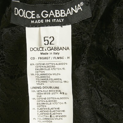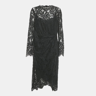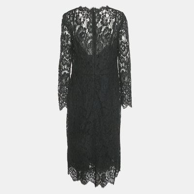 This Dolce and Gabbana dress drapes in intricate black lace over a sleeveless lining, offering coverage while letting the pattern shine. Sheer long sleeves add a whisper of transparency, creating a delicate contrast against the lined silhouette.