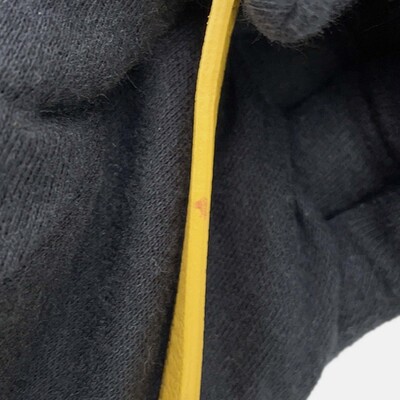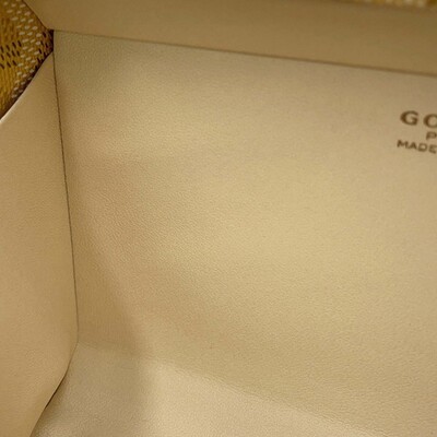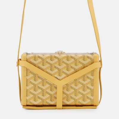 The Goyard Menodiaire Trunk bag in yellow and gold offers a structured form with the brand’s signature hand painted chevron pattern. Crafted in durable coated canvas with leather trim, it features a hinged opening and shoulder strap for easy transport.
