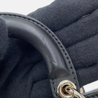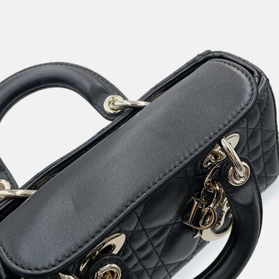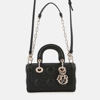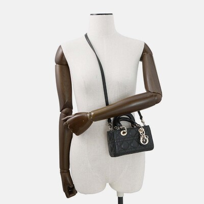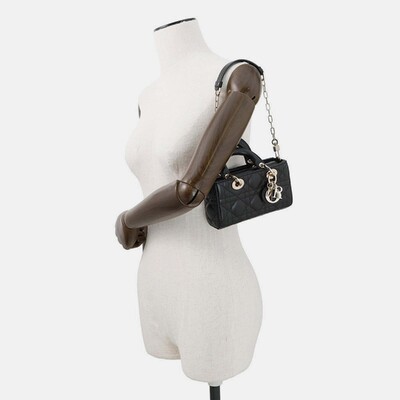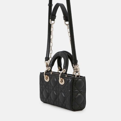 The Dior Lady D JOY micro bag in black lambskin features the house’s signature Cannage stitching and a compact profile designed for versatile styling. With two way carry options — top handle or shoulder strap — it brings ease to everyday dressing. Finished with gold tone hardware and a soft leather texture.