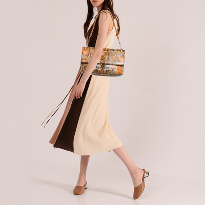 The Carine shoulder bag commands attention without ceremony, its python skin painted in shades of orange, brown, and cream. A front gold tone accent softens the exotic texture, while Tom Ford’s unmistakable presence infuses the piece with confidence.
