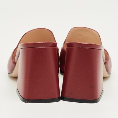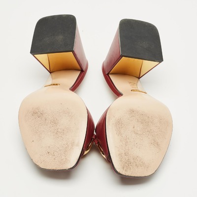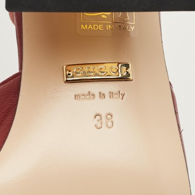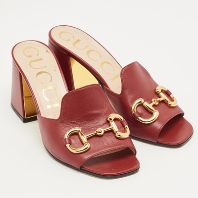 Gucci slides feature burgundy leather with a signature horsebit accent across the vamp. An open toe and block heel make these as wearable as they are recognizable.