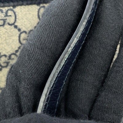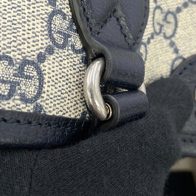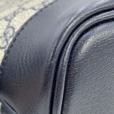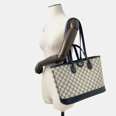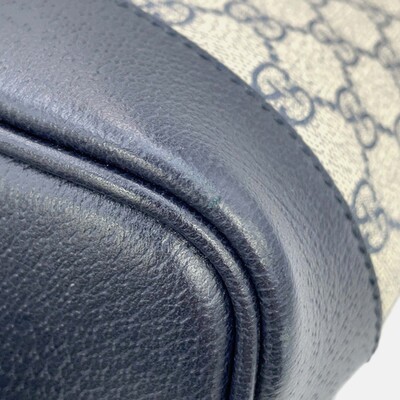 This Gucci Ophidia tote in beige and navy GG Supreme canvas offers two way carrying with top handles and a shoulder strap. Accented with classic Web stripe detailing.