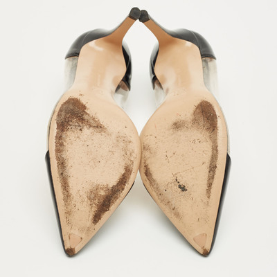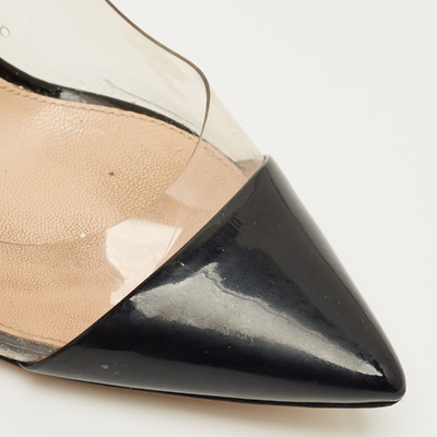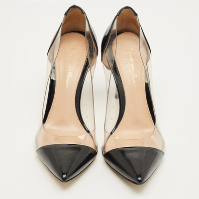 Sleek and modern, these Gianvito Rossi Plexi pumps blend black patent leather with clear PVC panels for a barely there illusion. The pointed toe silhouette enhances length and allure. A contemporary twist on classic sophistication.