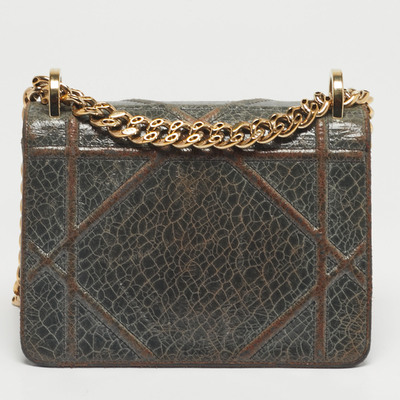 The Diorama Club bag tells a story of texture and contrast — green leather with a ceramic like sheen, traced with aged lines that speak of character. Its gold chain and bold clasp catch the light like fragments of a city at dusk.