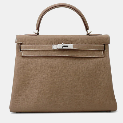 Hermès Kelly Retourne in Etoupe Togo Leather 32 is the epitome of classic, authentic designer luxury. Structured and polished, it exudes timeless sophistication. An iconic tote that elevates any refined wardrobe with effortless elegance.