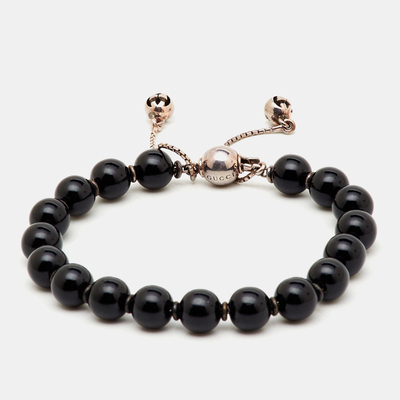 Gucci’s Boule Britt bracelet captures understated sophistication through polished black beads offset by a gleaming silver clasp. The contrast of textures evokes the label’s fusion of classic and modern. Designed to transition effortlessly from day to night, it lends quiet distinction to any wrist stack or solo wear.
