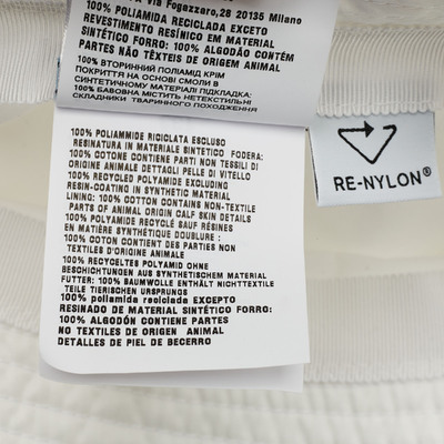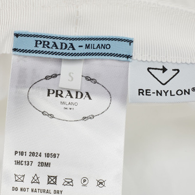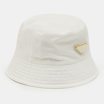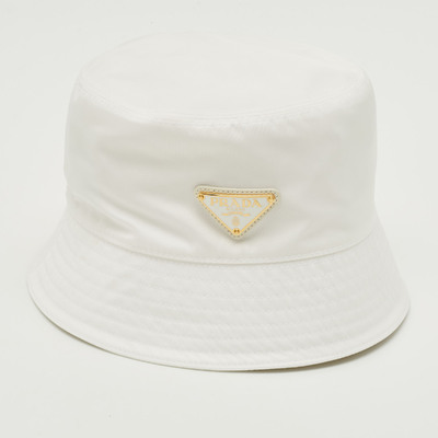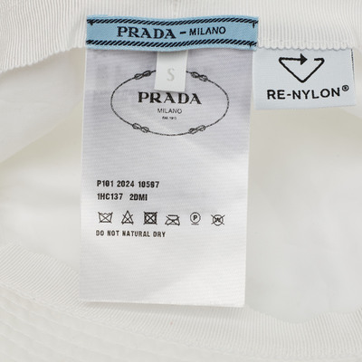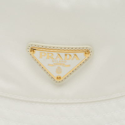 Prada reimagines casual luxury through sustainable innovation with this Re Nylon bucket hat. The crisp white finish and tonal logo plaque exude minimalist sophistication. Lightweight and versatile, it’s a modern essential for sun soaked days or city outings.