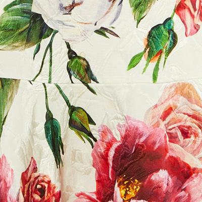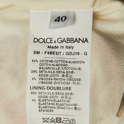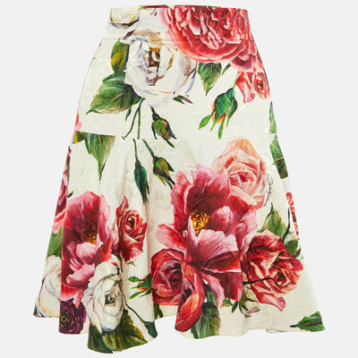 Delicately woven in a cotton silk blend, this Dolce and Gabbana mini skirt features floral jacquard detailing for a refined texture. Its structured silhouette offers a flattering fit with timeless elegance. Ideal for pairing with blouses or knitwear.