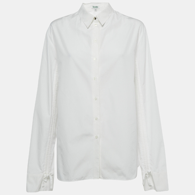 This Kenzo poplin shirt reimagines a classic white button down with drawstring ruched sleeves for a contemporary twist. Relaxed yet structured, it adds character to everyday styling. Perfect for pairing with tailored trousers or denim.