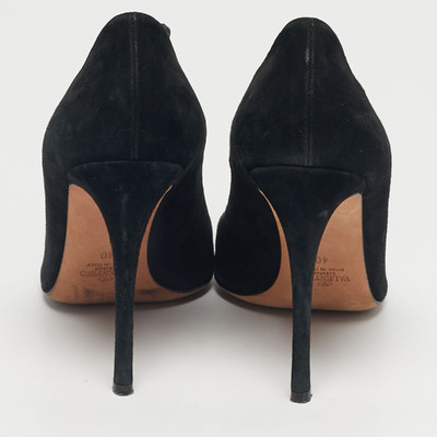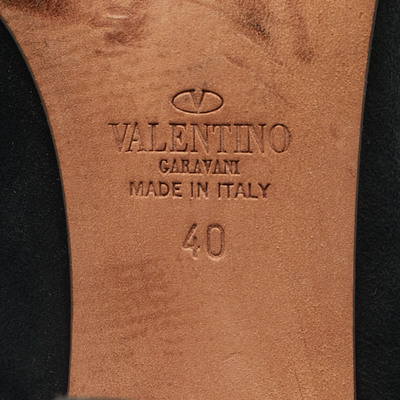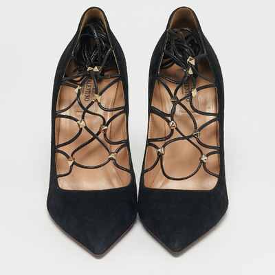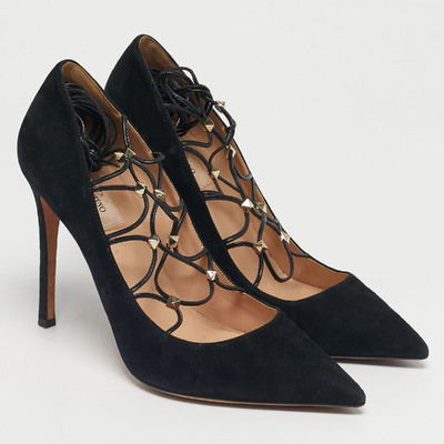 These Valentino pumps combine black leather and suede with the brand’s iconic Rockstud accents. The lace up design adds edgy sophistication, making them a bold statement piece. Perfect for elevating both dresses and tailored trousers.