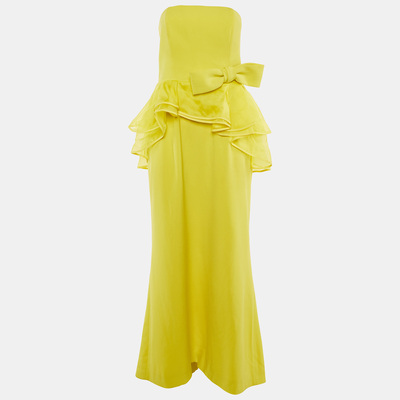 Radiant in sunshine yellow, this strapless Paule Ka gown features an oversized bow and asymmetric frill detailing for a dramatic, couture inspired finish. Crafted from smooth crepe, it flows elegantly with every step. A show stopping choice for formal events.