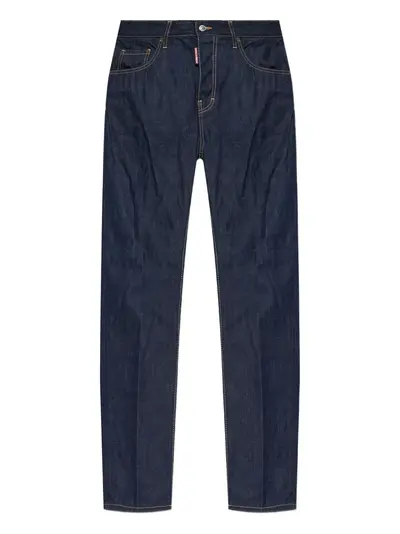 dark blue topstitching five pockets belt loops button fastening regular finish