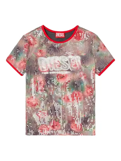 floral print sequin embellishment crew neck short sleeves logo detail solid colour trims