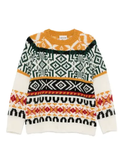 white/multicolor crew neck jacquard motif long sleeves ribbed cuffs and hem