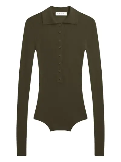khaki ribbed knit button closure polo collar long sleeves