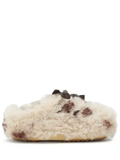 off-white curly fur lace-up detail flat sole rounded toe mottled brown pattern