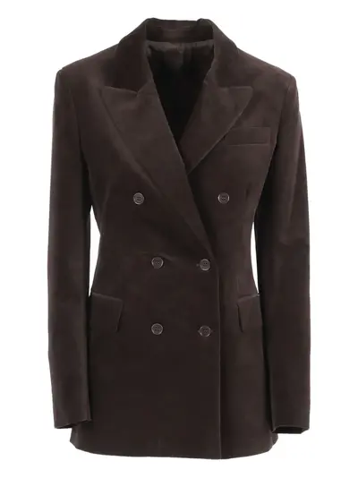 brown double breasted button fastening peak lapels flap pockets buttoned cuffs
