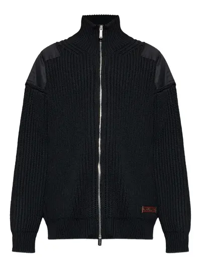 black ribbed effect shoulder panels high neck front zip fastening long sleeves
