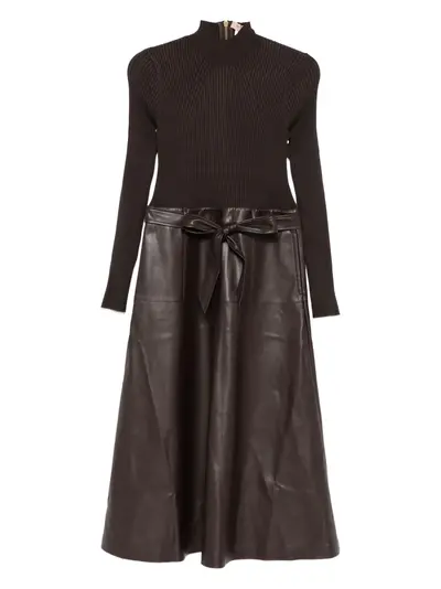 chocolate brown ribbed knit high neck long sleeves belted waist A-line skirt