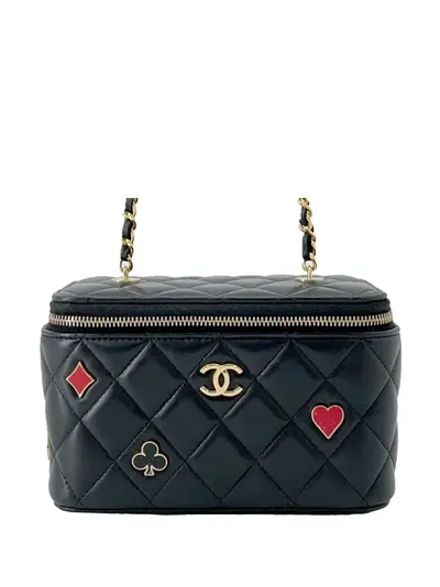This vanity bag features a quilted lambskin leather body, a leather woven chain strap, a top zip-around closure, interior slip pockets, and an interior mirror. Black. This item has no inclusions. Condition: EXCELLENT. This previously owned item is in near-perfect condition with no signs of damage or use. Due to the exclusivity of this item and its limited availability, processing and delivery might take longer than usual. Please refer to the photos on this product page for a detailed view of the item, including any damages declared.