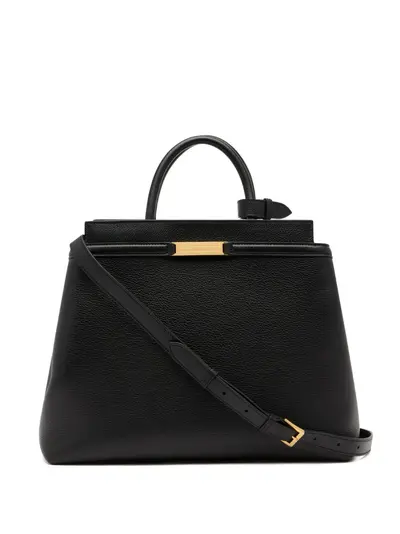 black grained leather gold-tone logo plaque two top handles removable shoulder strap
