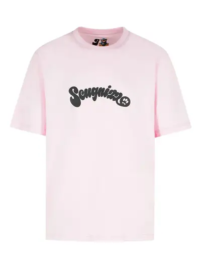 pink ribbed crew neck folkloric symbols short sleeves