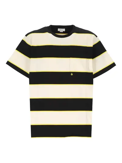 black and beige striped pattern chest patch pocket round neck short sleeves inverted skull detail